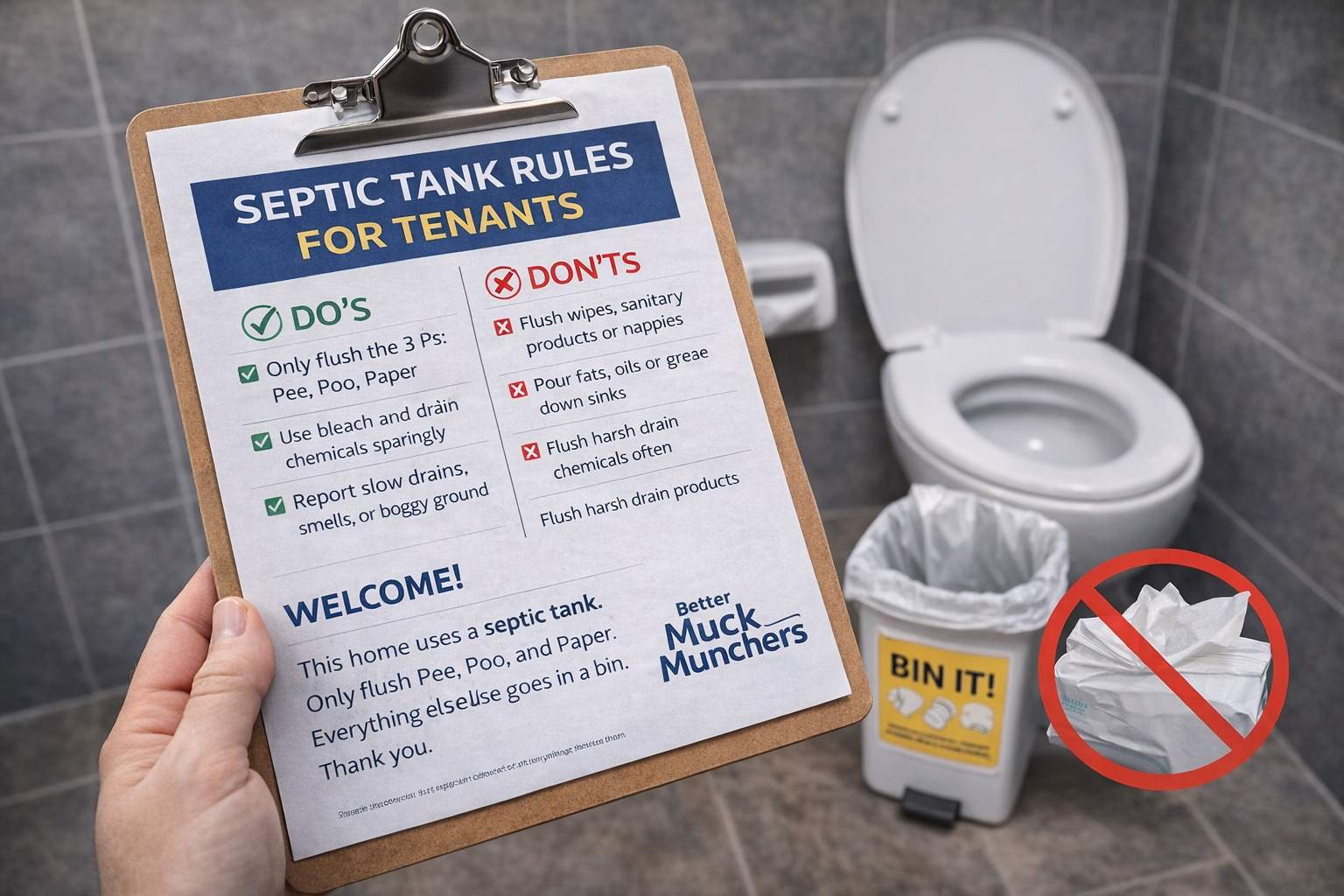 Updated for 2026 – Septic tank rules for tenants are simple. Tenants: only flush the 3 Ps and avoid harsh chemicals. Landlords: keep the system maintained and desludged when needed.
